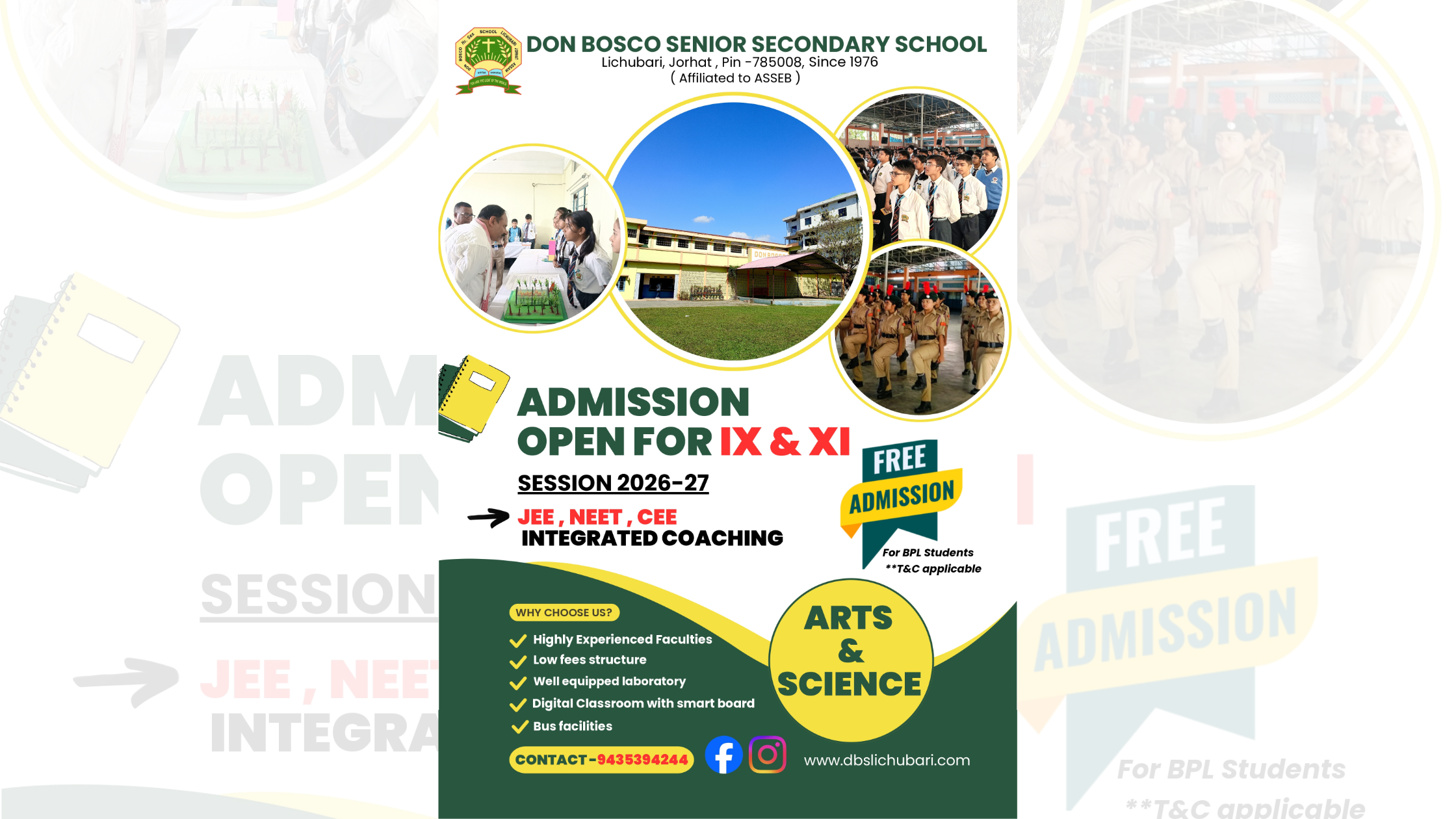 Don Bosco Higher Secondary School, Lichubari, Jorhat is pleased to announce that admissions are now open for Classes IX and XI (Arts & Science Stream) for the academic session 2026–2027. As one of the most trusted educational institutions in Upper Assam, we continue our mission to nurture young minds with values, discipline, and high-quality education. With a legacy of academic excellence and holistic development, Don Bosco Lichubari invites students to join a learning environment that inspires curiosity, critical thinking, and lifelong success.